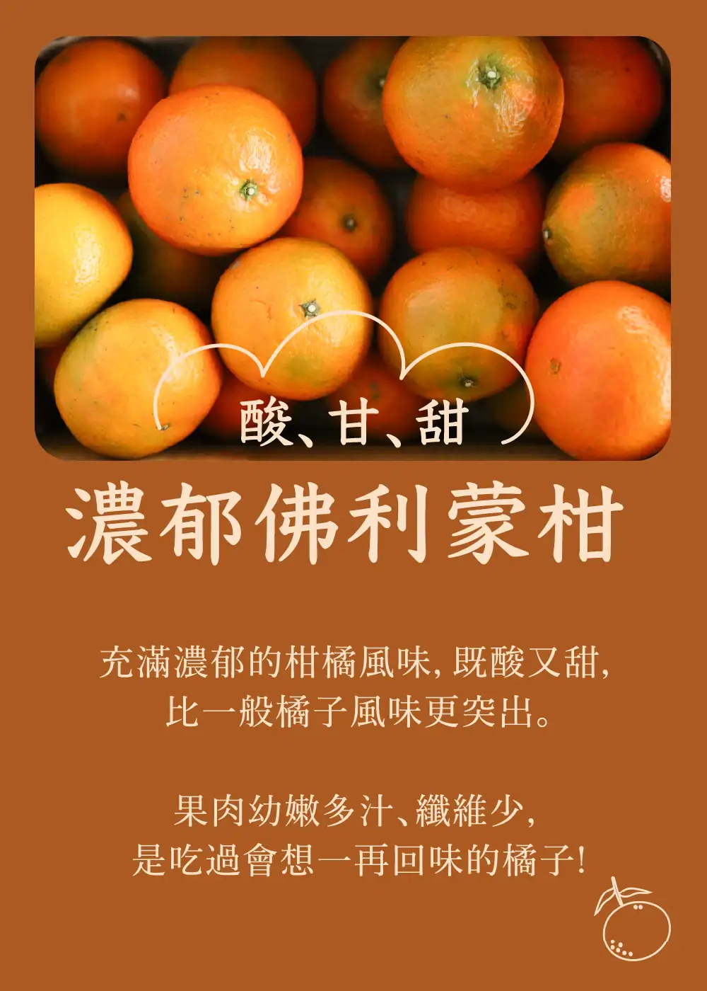 (冬季佛利蒙柑也會較秋季的更濃郁,已經在預購頁另外上架。請往年購買的是冬季的顧客們留意喔)