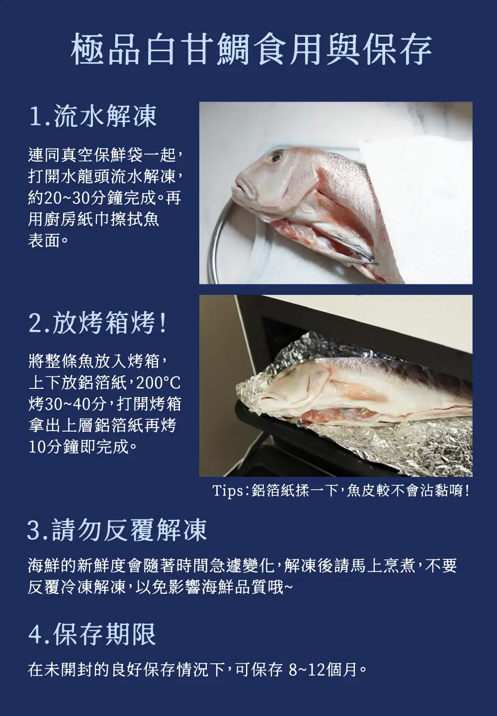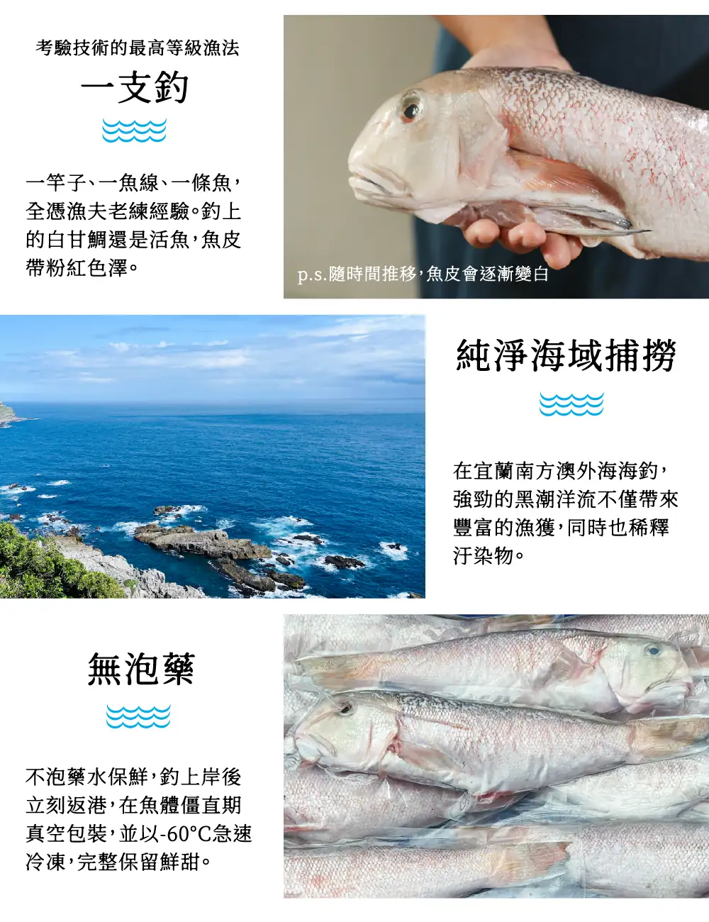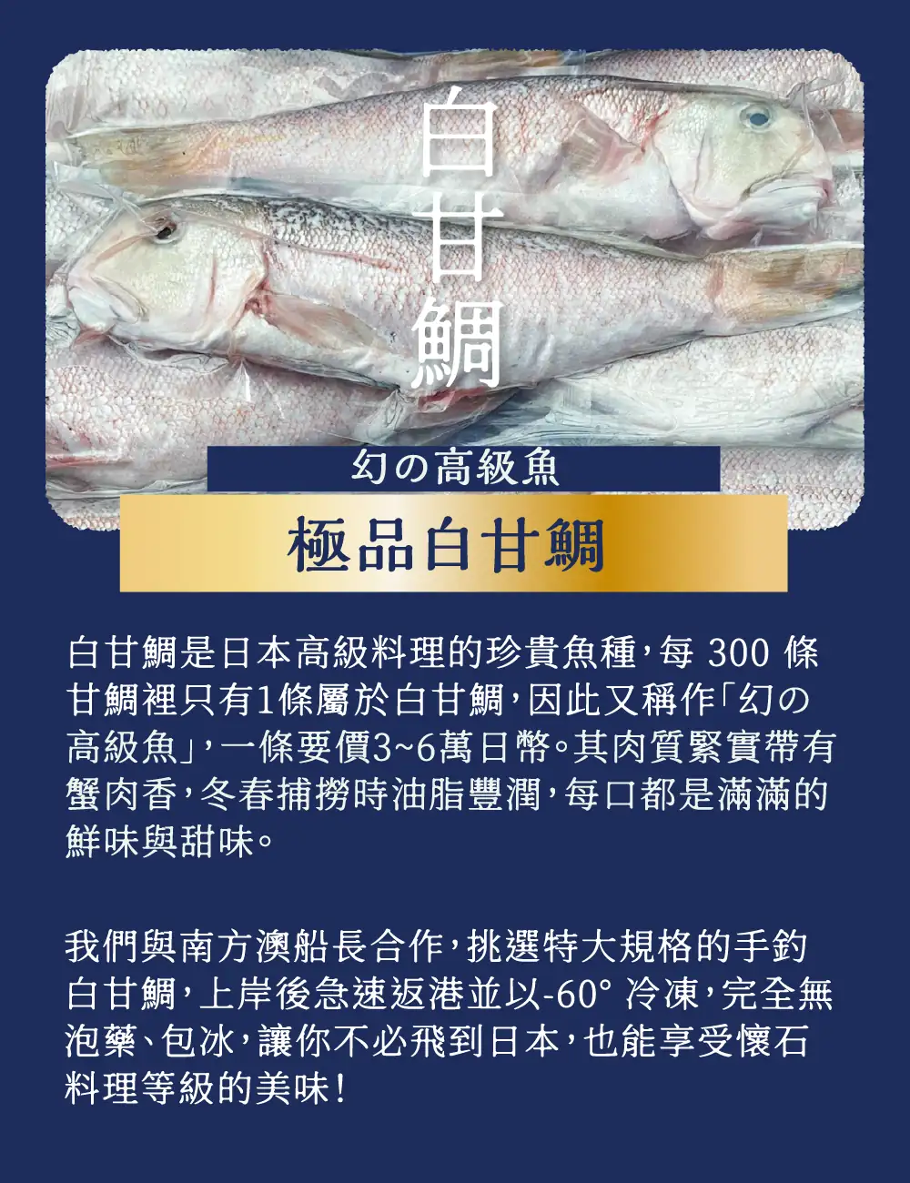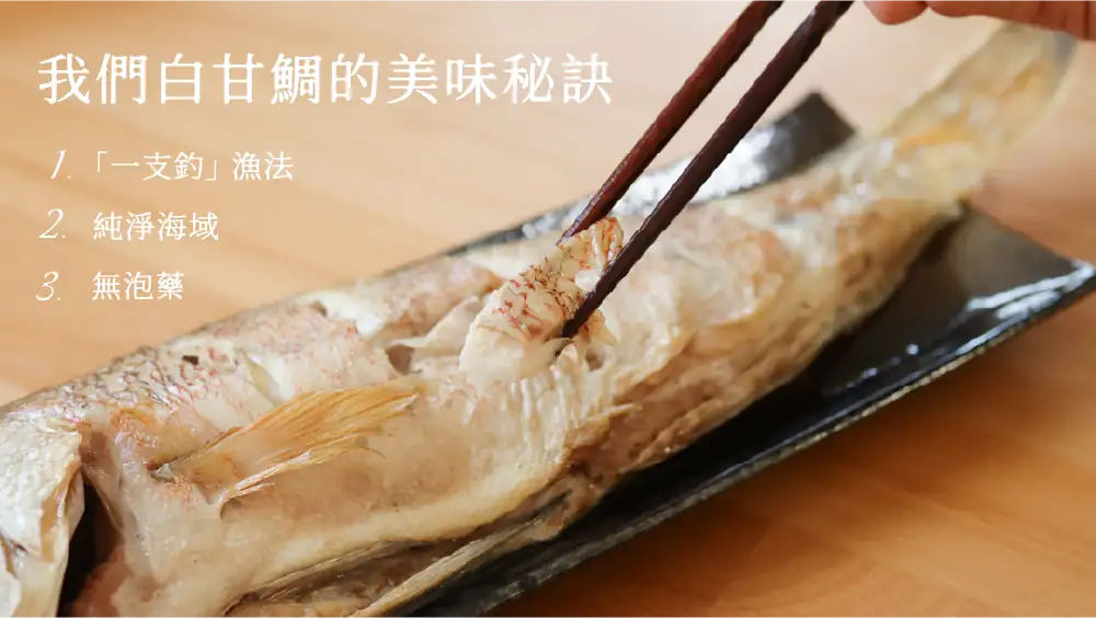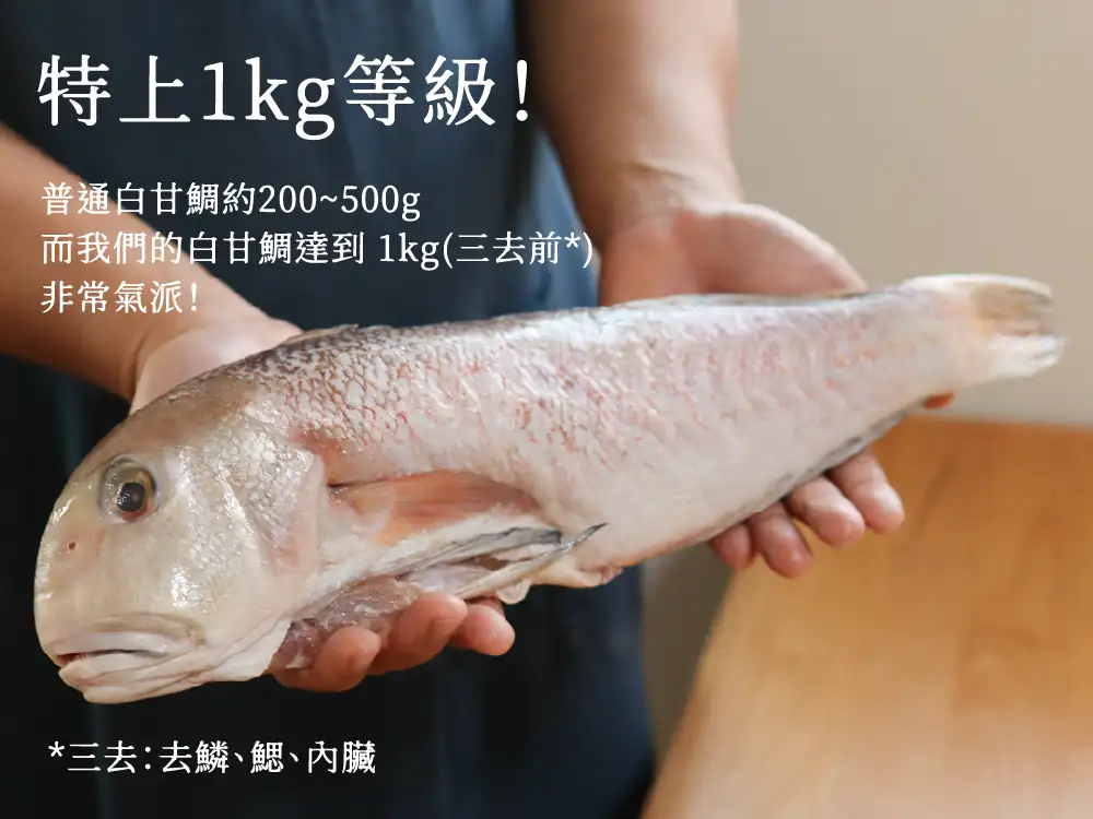 ▍嚴選 𝟏𝐤𝐠 以上、來自宜蘭南方澳純淨海域「一支釣」的白甘鯛(馬頭魚),上岸時還是活魚,當日手釣返港,去除鰓、鱗、內臟後以-𝟔𝟎°𝐂急速冷凍,魚肉鮮甜帶有螃蟹香氣,無論乾煎、清蒸都滿好吃~!